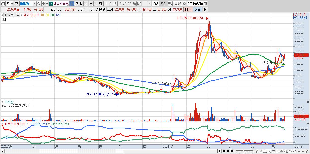 - 에코앤드림 (52,500원 ▲ 9.26% , 시총: 6,014억, 거래량: 986,130, 거래대금:513억)