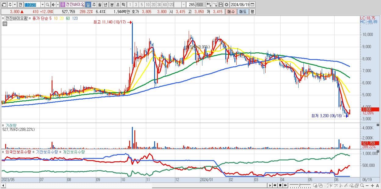 - 전진바이오팜 (3,800원 ▲ 12.09% , 시총: 313억, 거래량: 527,759, 거래대금:19억)