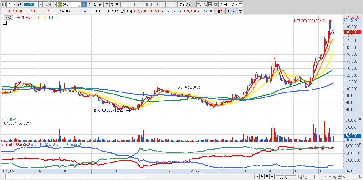 - SKC (182,500원 ▲ 0.27% , 시총: 69,110억, 외국인 순매수 거래금:82억)