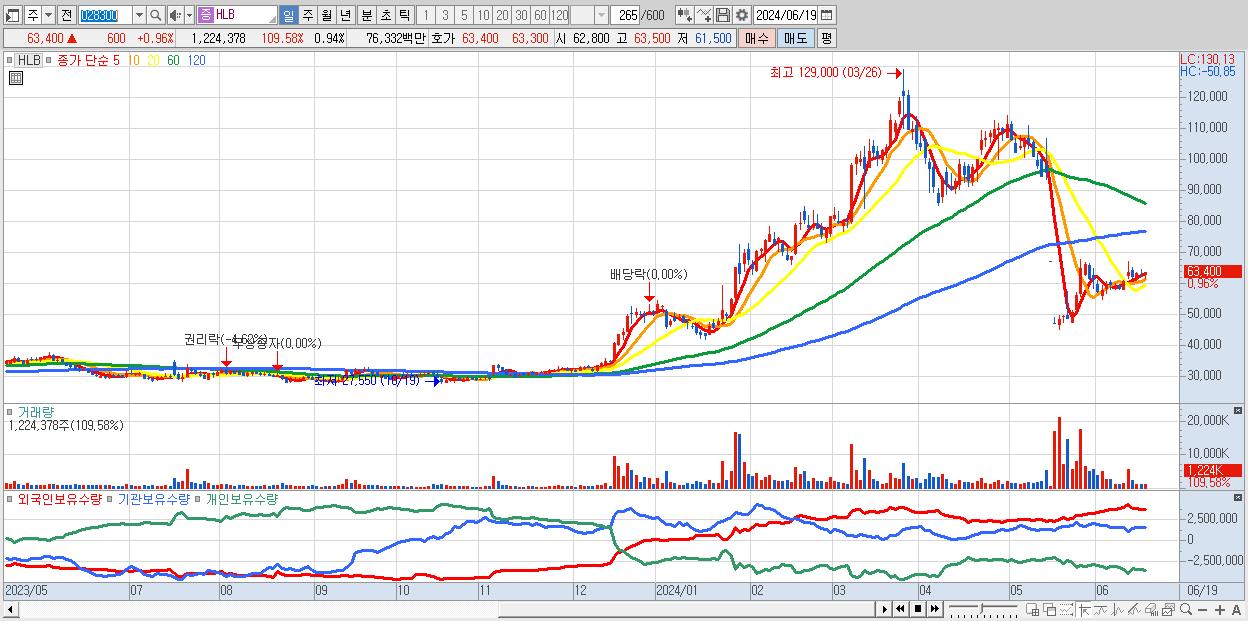 - HLB (63,400원 ▲ 0.96% , 시총: 82,956억, 외국인 순매수 거래금:90억)