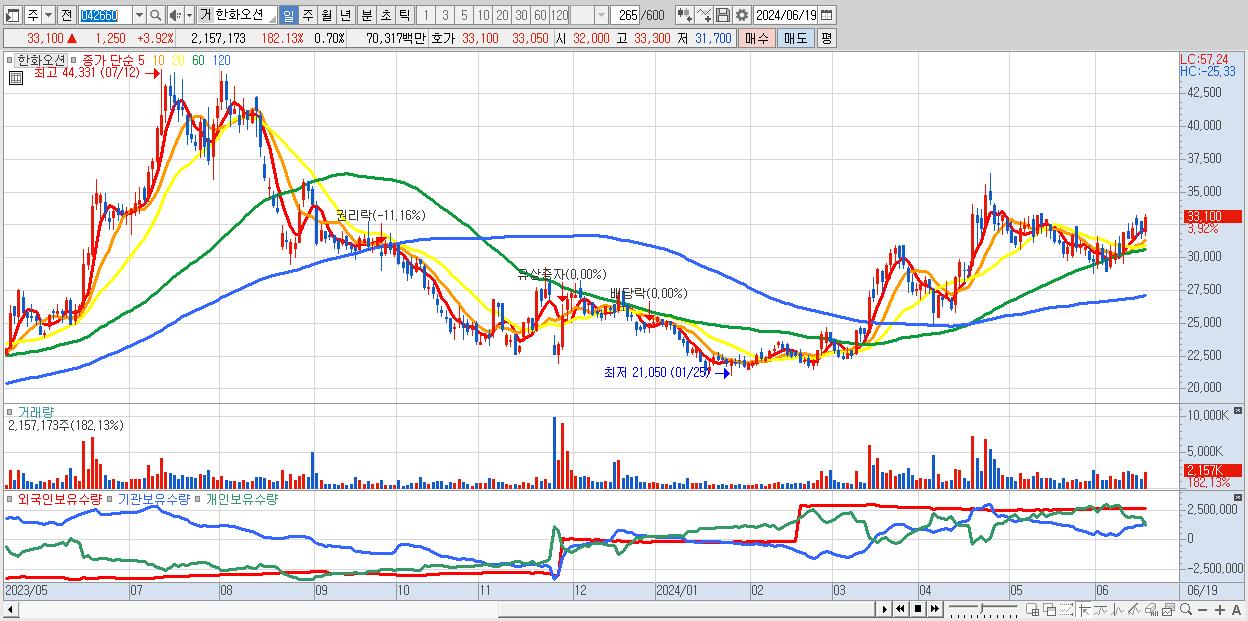 - 한화오션 (33,100원 ▲ 3.92% , 시총: 101,405억, 외국인 순매수 거래금:87억)