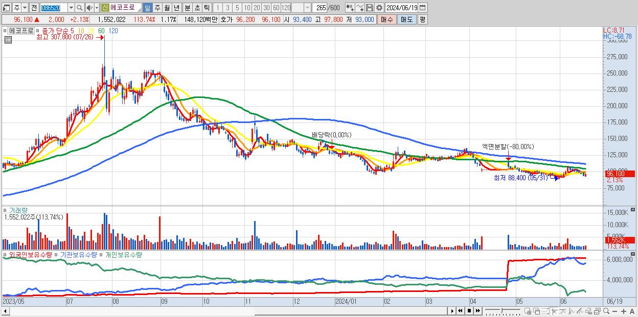 - 에코프로 (96,100원 ▲ 2.13% , 시총: 127,946억, 외국인 순매수 거래금:186억)