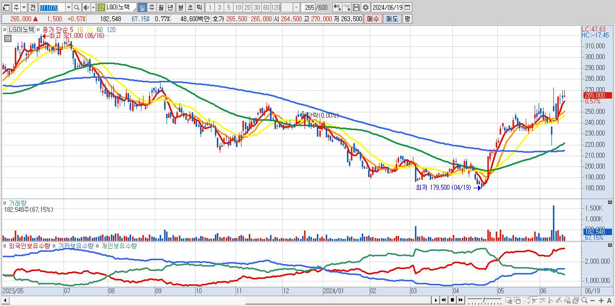 - LG이노텍 (265,000원 ▲ 0.57% , 시총: 62,718억, 외국인 순매수 거래금:84억)