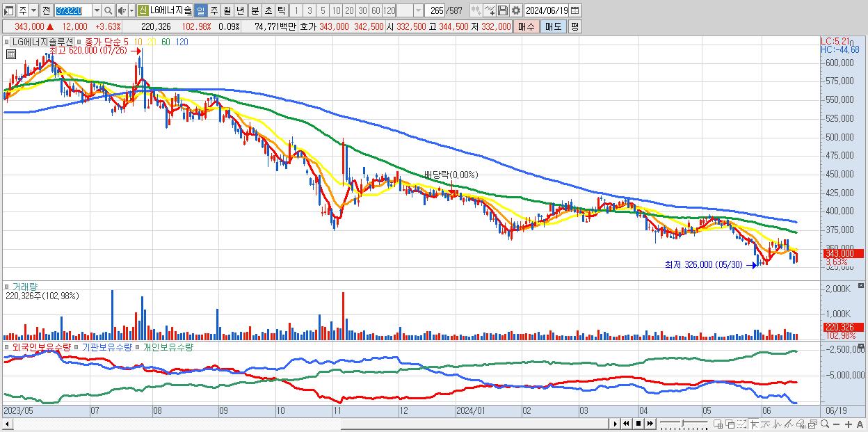 - LG에너지솔루션 (343,000원 ▲ 3.63% , 시총: 802,620억, 외국인 순매수 거래금:191억)