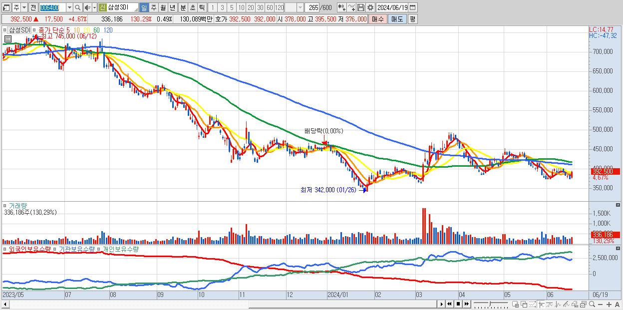 - 삼성SDI (392,500원 ▲ 4.67% , 시총: 269,901억, 외국인 순매수 거래금:239억)