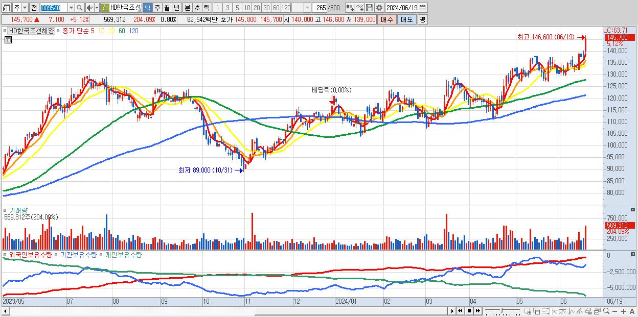 - HD한국조선해양 (145,700원 ▲ 5.12% , 시총: 103,116억, 외국인 순매수 거래금:235억)