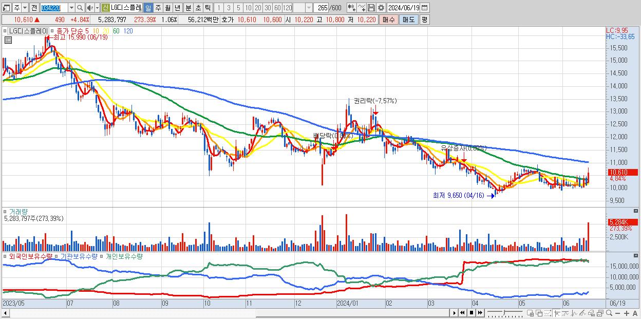 - LG디스플레이 (10,610원 ▲ 4.84% , 시총: 53,050억, 외국인 순매수 거래금:89억)