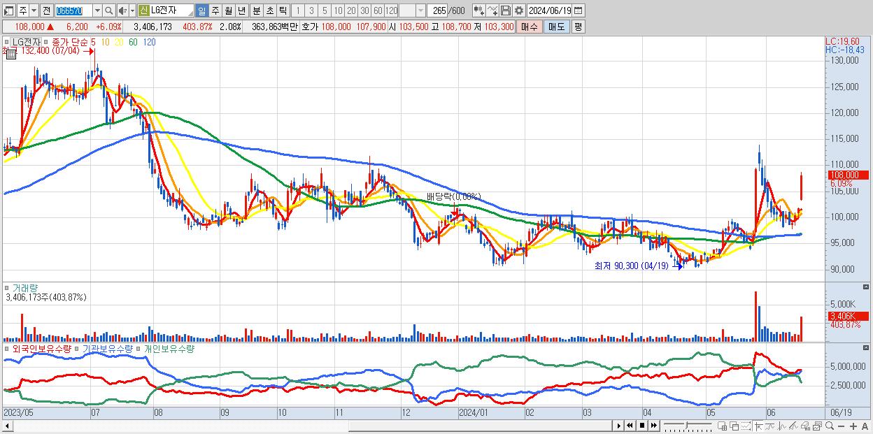 - LG전자 (108,000원 ▲ 6.09% , 시총: 176,740억, 외국인 순매수 거래금:805억)