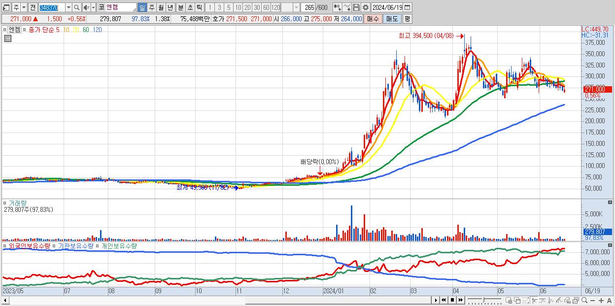 - 엔켐 (271,000원 ▲ 0.56% , 시총: 55,096억, 외국인 순매수 거래금:82억)