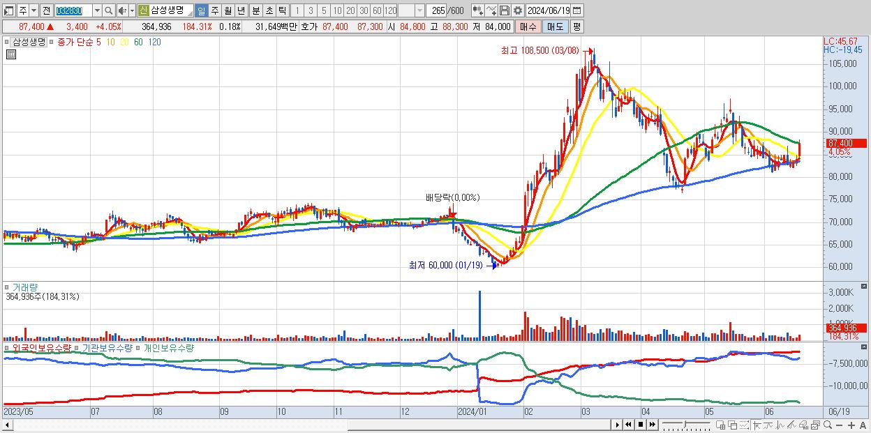 - 삼성생명 (87,400원 ▲ 4.05% , 시총: 174,800억, 외국인 순매수 거래금:69억)