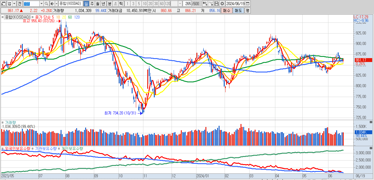 | 06/07 | 866.18 | ▲1.81% | -3,032억 | 3,255억 | -365억 | 142억 |