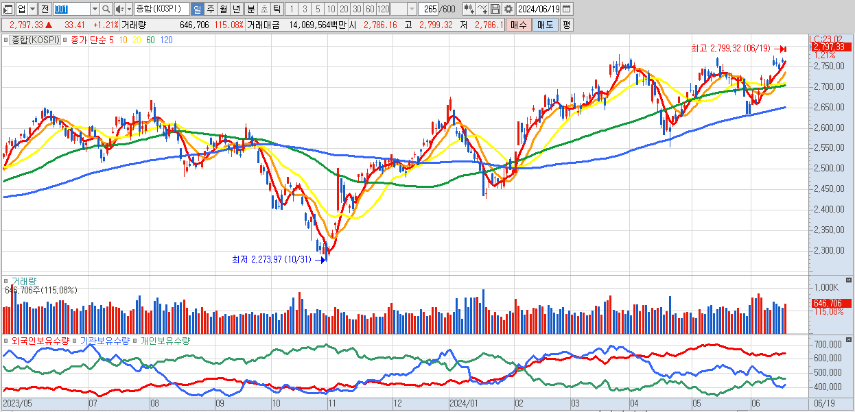 | 06/19 | 2,797.33 | ▲1.21% | -7,510억 | 2,736억 | 5,493억 | -719억 |