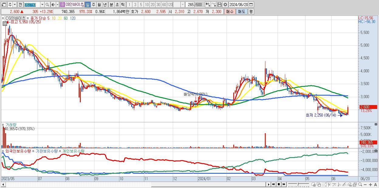 - CG인바이츠 (2,600원 ▲ 13.29% , 시총: 1,999억, 거래량: 740,365, 거래대금:19억)