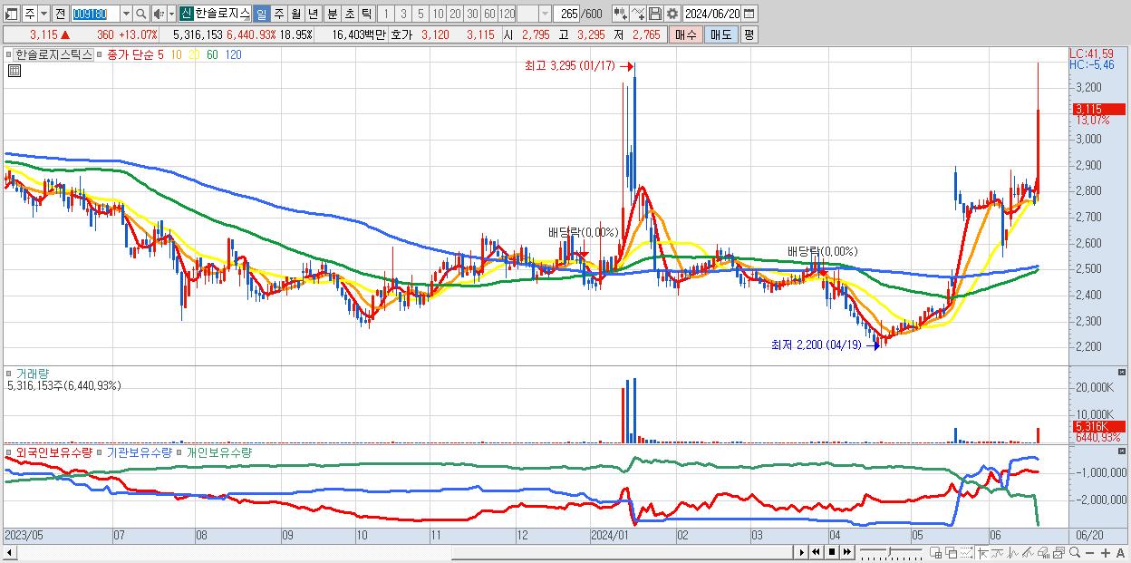 - 한솔로지스틱스 (3,115원 ▲ 13.07% , 시총: 874억, 거래량: 5,316,153, 거래대금:164억)