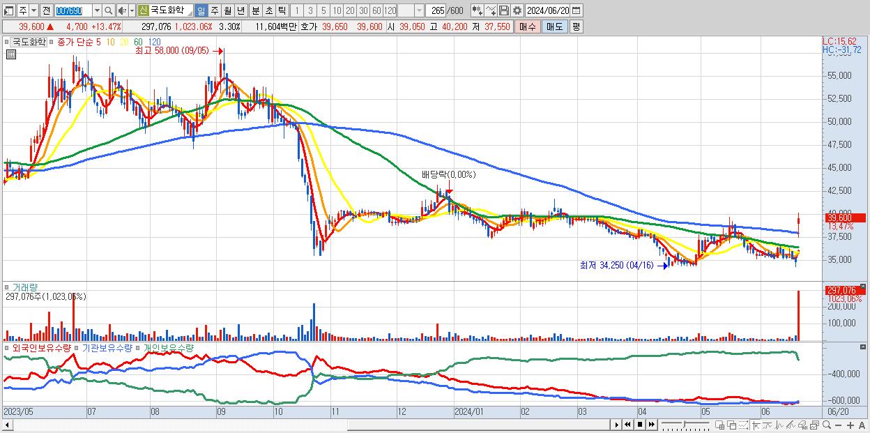 - 국도화학 (39,600원 ▲ 13.47% , 시총: 3,568억, 거래량: 297,076, 거래대금:116억)