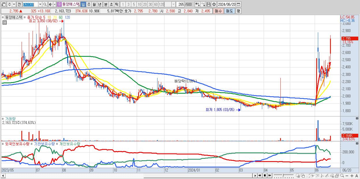 - 동양에스텍 (2,795원 ▲ 13.16% , 시총: 551억, 거래량: 2,163,723, 거래대금:58억)