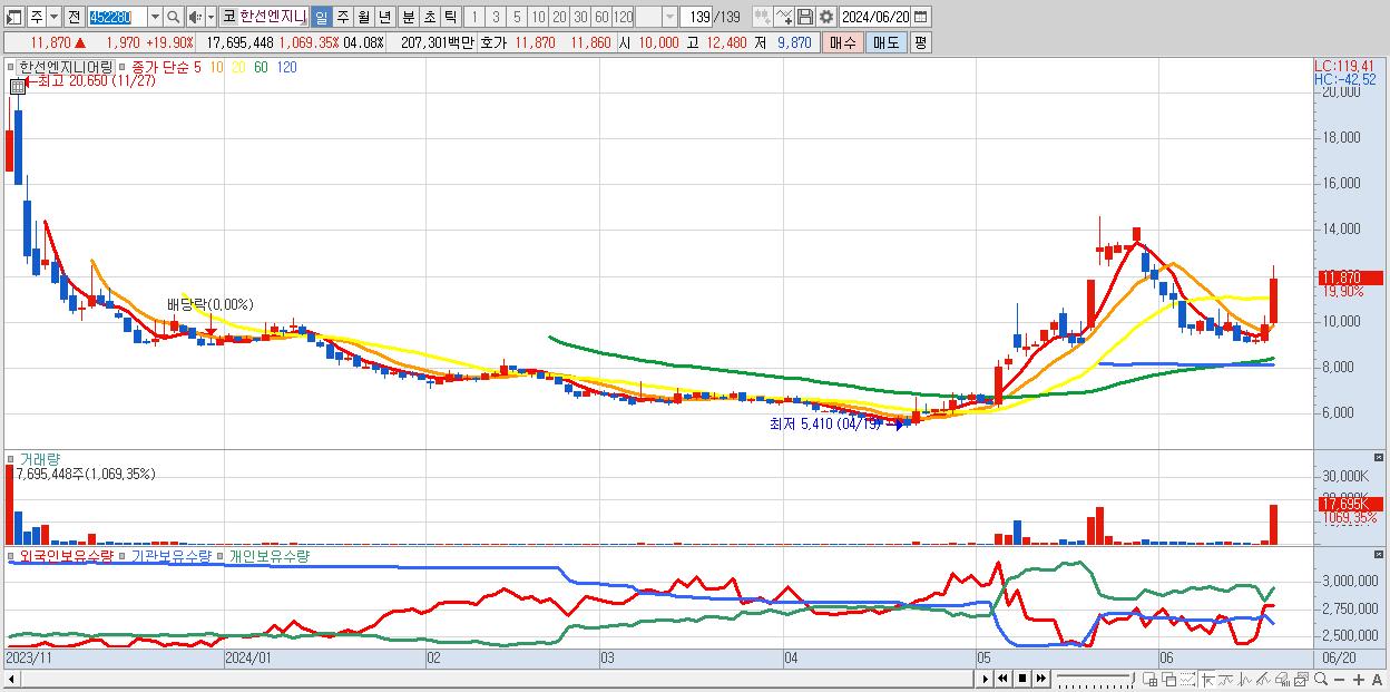 - 한선엔지니어링 (11,870원 ▲ 19.9% , 시총: 2,018억, 거래량: 17,695,448, 거래대금:2,073억)