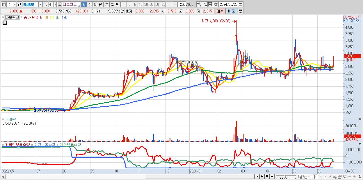 - 다보링크 (2,895원 ▲ 15.8% , 시총: 1,256억, 거래량: 3,543,966, 거래대금:97억)