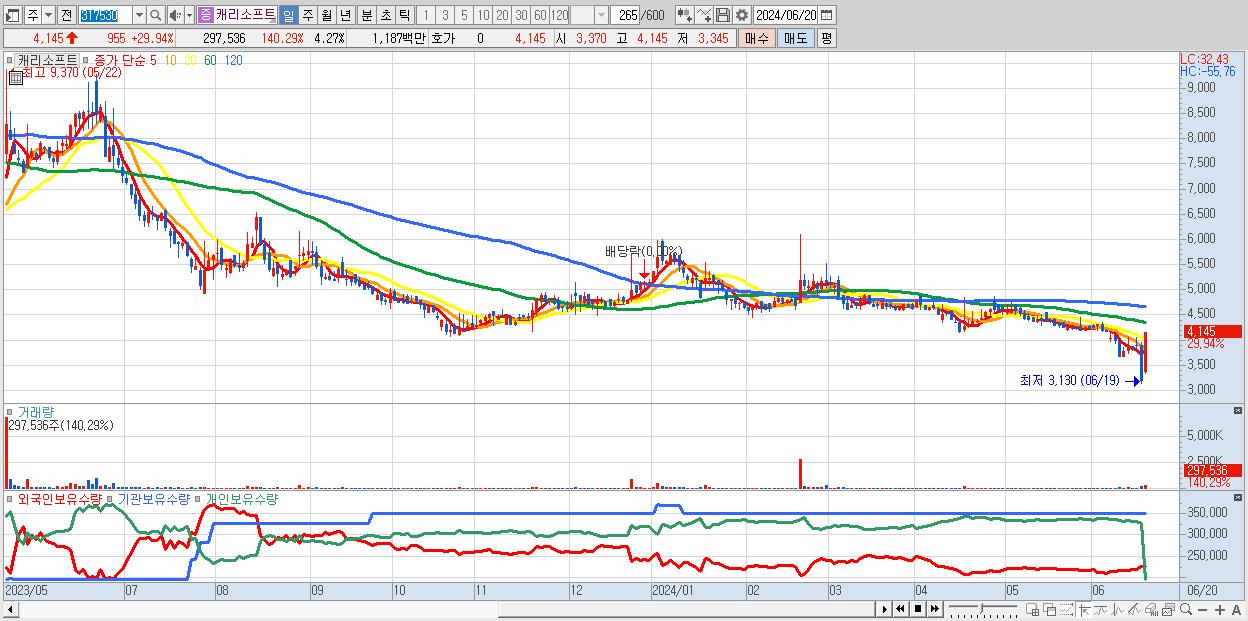 - 캐리소프트 (4,145원 ▲ 29.94% , 시총: 289억, 거래량: 297,536, 거래대금:12억)