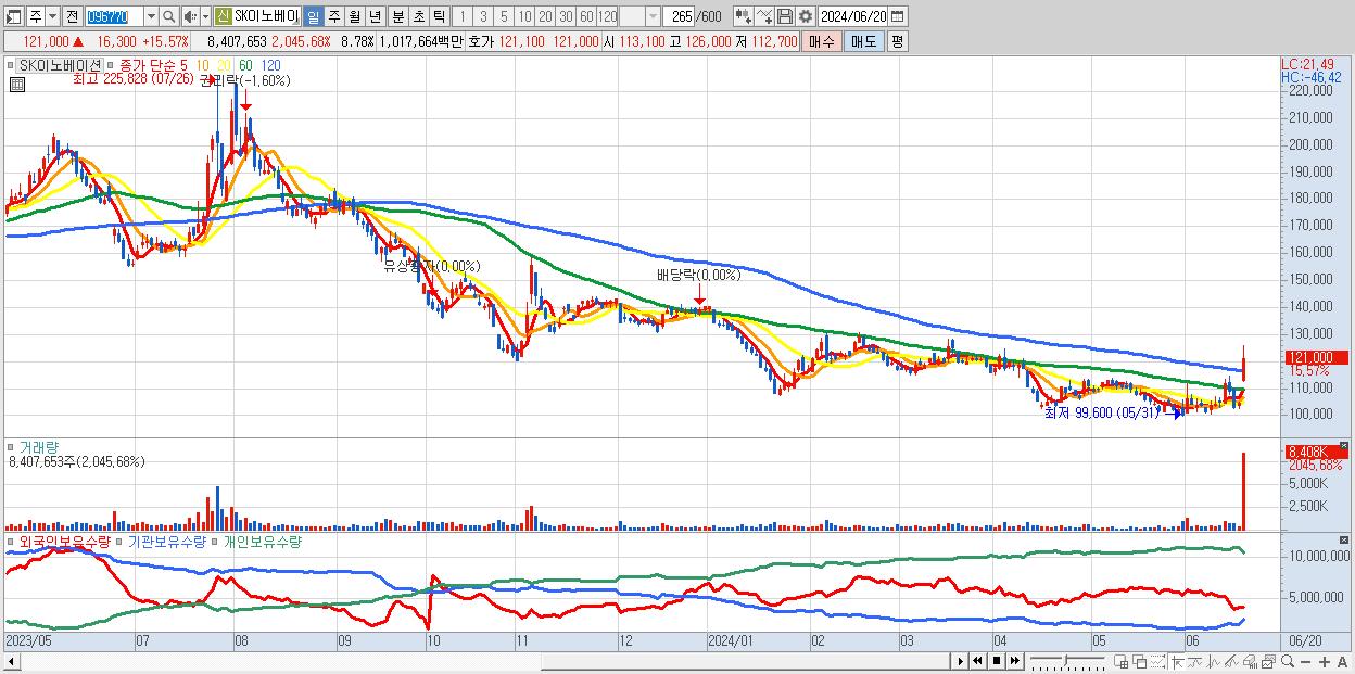 - SK이노베이션 (121,000원 ▲ 15.57% , 시총: 115,840억, 거래량: 8,407,653, 거래대금:10,177억)