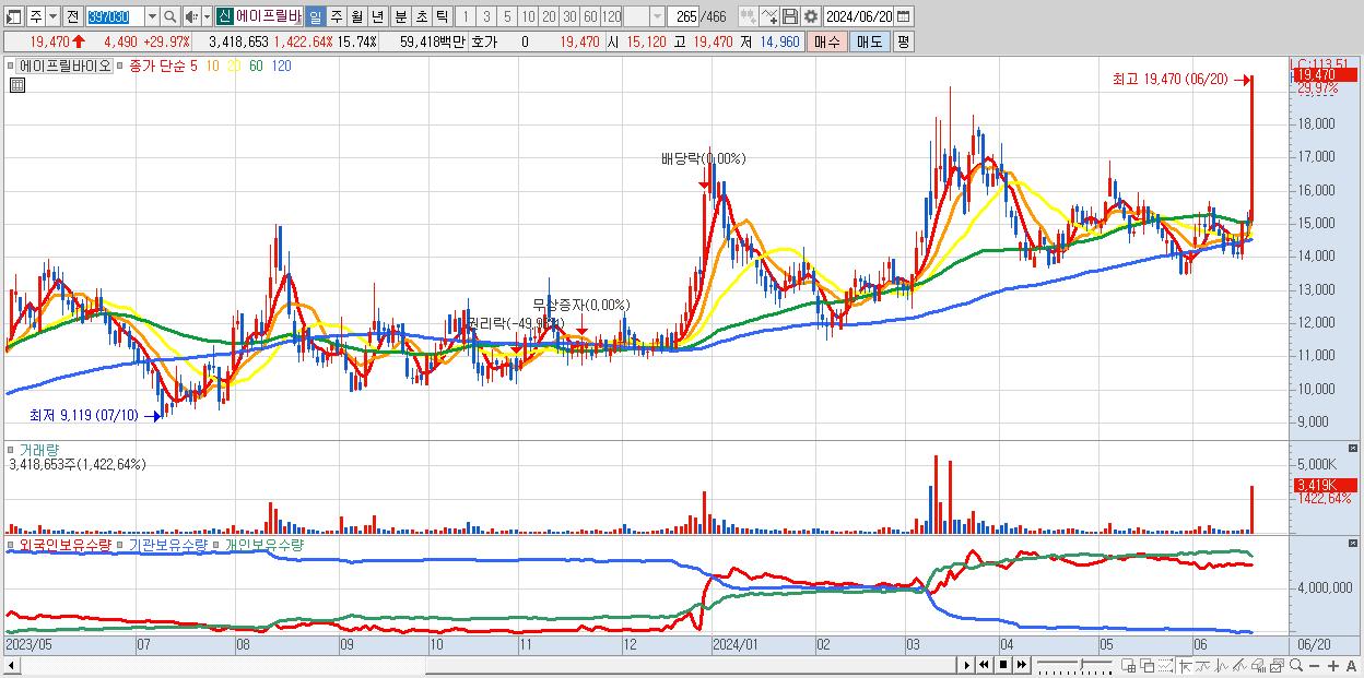 - 에이프릴바이오 (19,470원 ▲ 29.97% , 시총: 4,229억, 거래량: 3,418,653, 거래대금:594억)