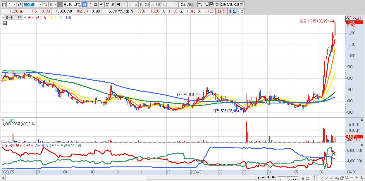 - 플레이그램 (1,295원 ▲ 9.75% , 시총: 1,641억, 거래량: 4,683,998, 거래대금:60억)