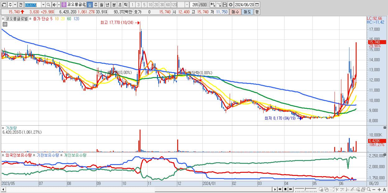 - 코오롱글로벌 (15,740원 ▲ 29.98% , 시총: 2,980억, 거래량: 6,420,203, 거래대금:934억)