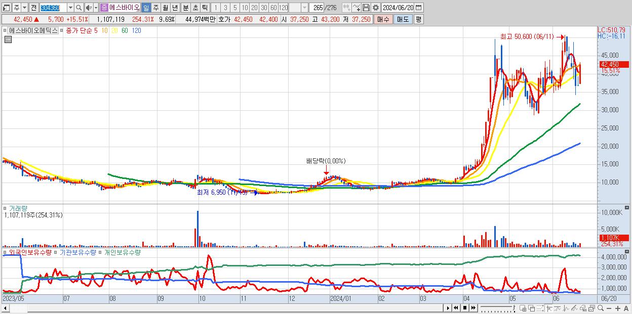 - 에스바이오메딕스 (42,450원 ▲ 15.51% , 시총: 4,851억, 거래량: 1,107,119, 거래대금:450억)