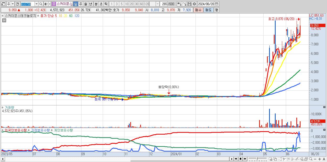 - 스카이문스테크놀로지 (9,050원 ▲ 12.42% , 시총: 1,549억, 거래량: 4,572,923, 거래대금:413억)