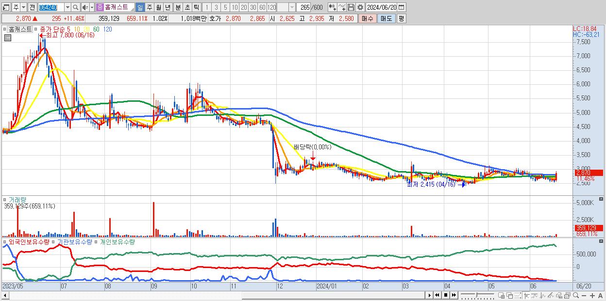 - 홈캐스트 (2,870원 ▲ 11.46% , 시총: 1,006억, 거래량: 359,129, 거래대금:10억)