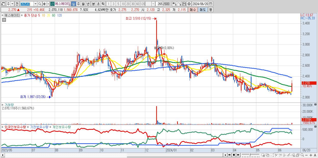 - 에스에이티 (2,270원 ▲ 10.46% , 시총: 593억, 거래량: 2,070,118, 거래대금:46억)