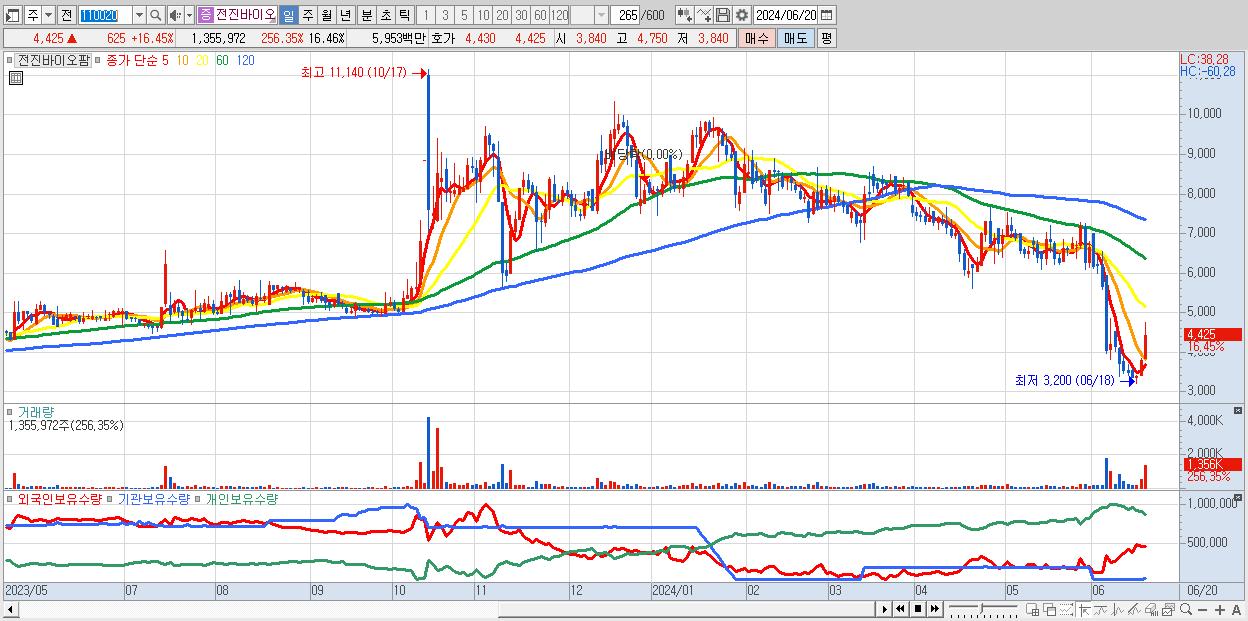 - 전진바이오팜 (4,425원 ▲ 16.45% , 시총: 364억, 거래량: 1,355,972, 거래대금:60억)