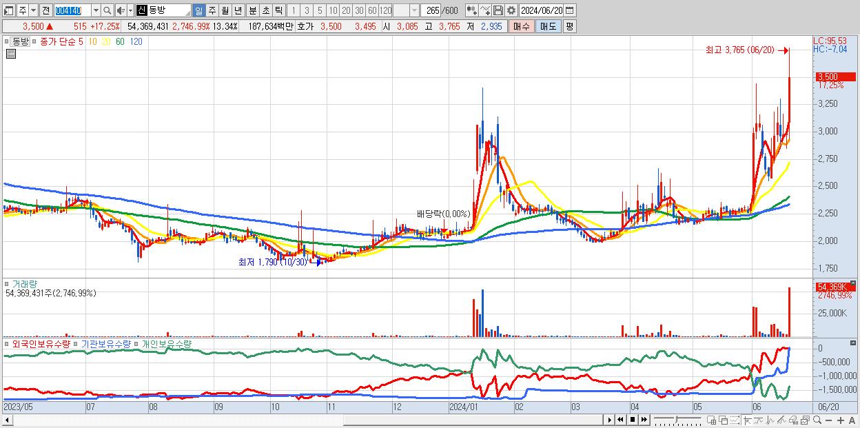 - 동방 (3,500원 ▲ 17.25% , 시총: 1,679억, 거래량: 54,369,431, 거래대금:1,876억)