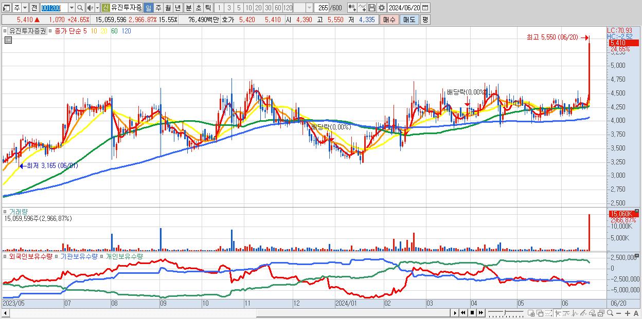 - 유진투자증권 (5,410원 ▲ 24.65% , 시총: 5,240억, 거래량: 15,059,596, 거래대금:765억)