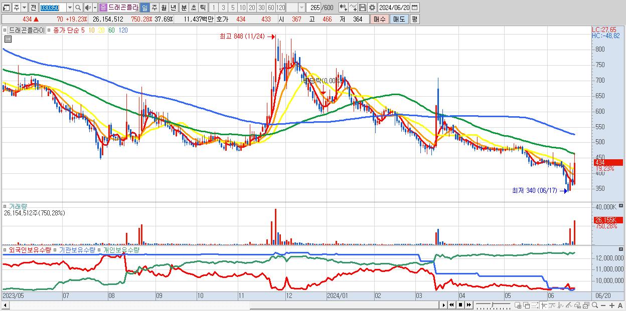 - 드래곤플라이 (434원 ▲ 19.23% , 시총: 301억, 거래량: 26,154,512, 거래대금:114억)