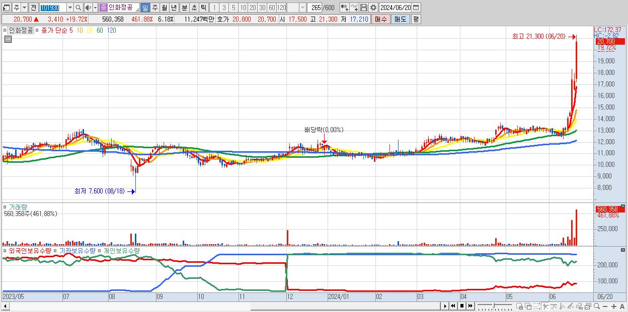 - 인화정공 (20,700원 ▲ 19.72% , 시총: 1,877억, 거래량: 560,358, 거래대금:112억)