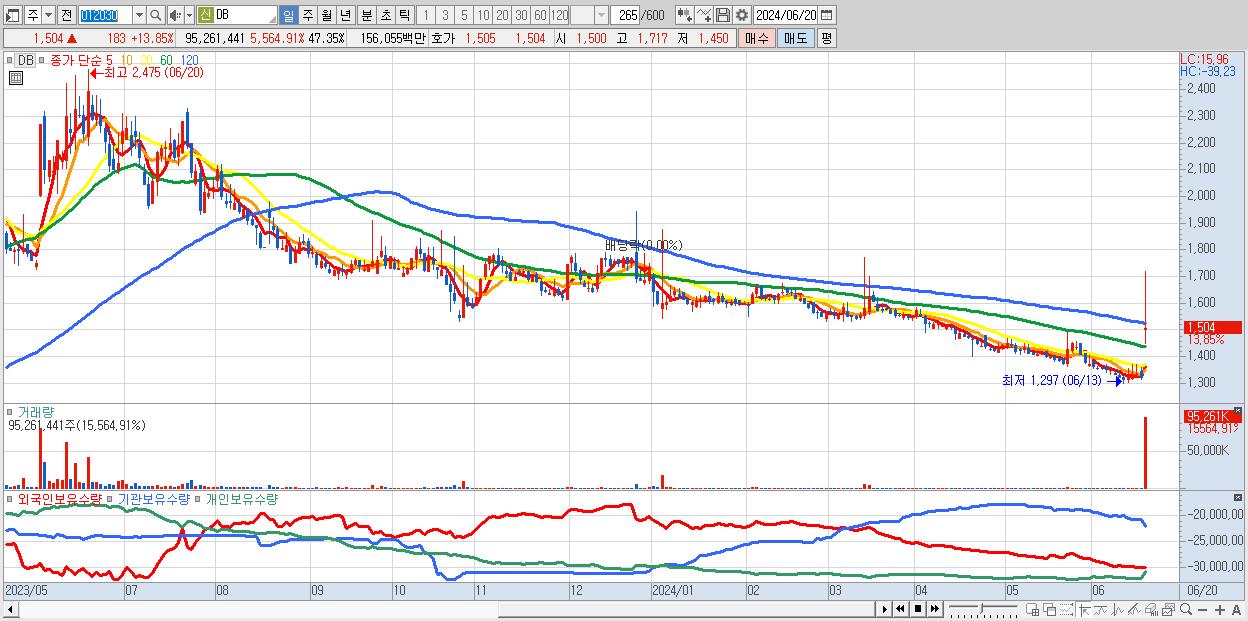 - DB (1,504원 ▲ 13.85% , 시총: 3,026억, 거래량: 95,261,441, 거래대금:1,561억)