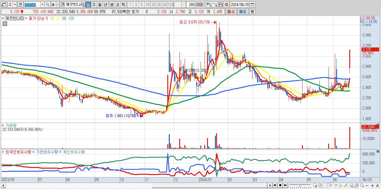 - 깨끗한나라 (3,125원 ▲ 29.94% , 시총: 1,164억, 거래량: 22,333,540, 거래대금:675억)