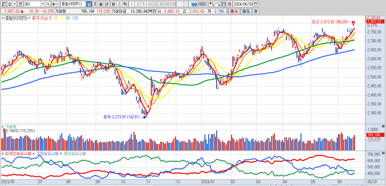 | 06/20 | 2,807.63 | ▲0.37% | -5,845억 | 4,941억 | 1,654억 | -749억 |