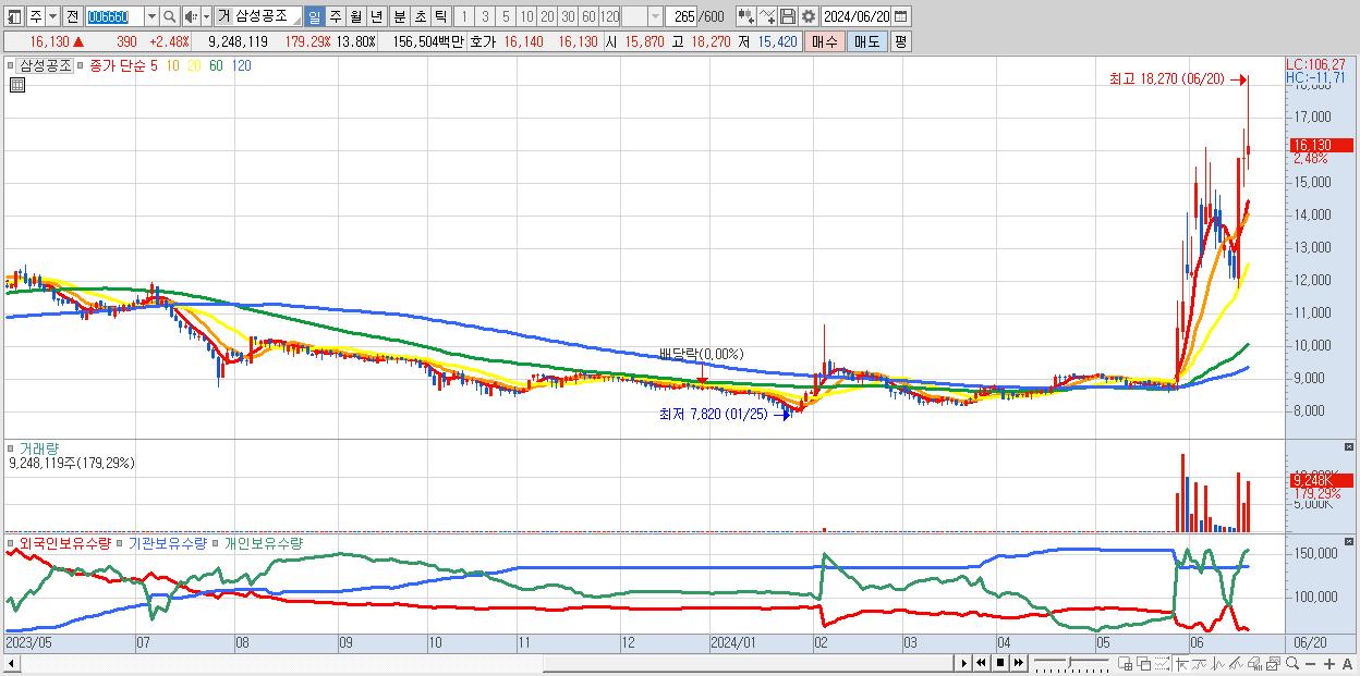 - 삼성공조 (16,130원 ▲ 2.48% , 시총: 1,311억, 거래량: 9,248,119, 거래대금:1,565억)