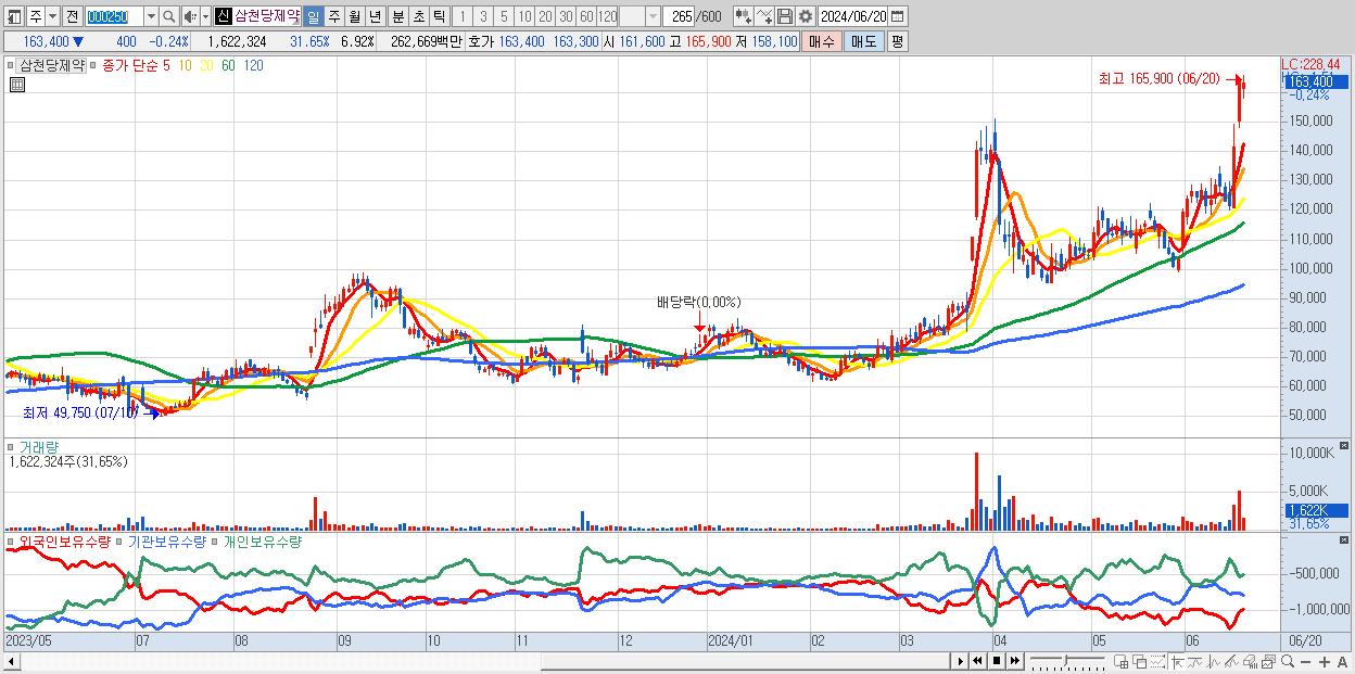 - 삼천당제약 (163,400원 ▼ -0.24% , 시총: 38,330억, 거래량: 1,622,324, 거래대금:2,627억)