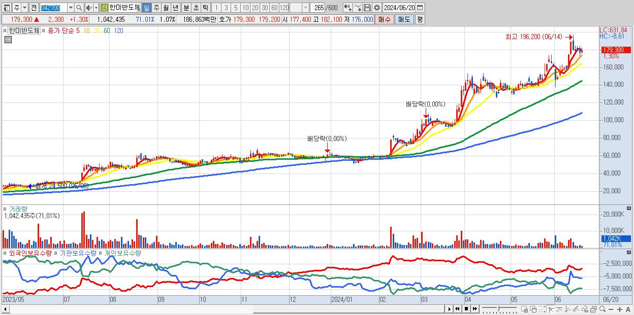- 한미반도체 (179,300원 ▲ 1.3% , 시총: 173,910억, 거래량: 1,042,435, 거래대금:1,869억)