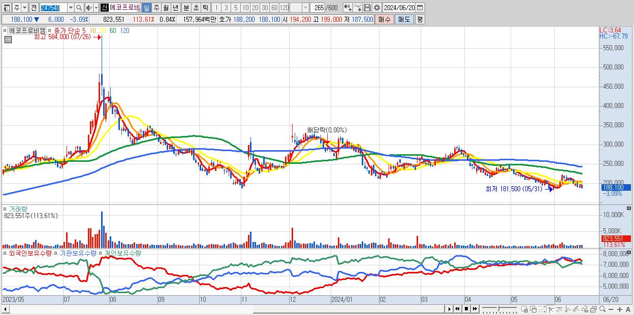 - 에코프로비엠 (188,100원 ▼ -3.09% , 시총: 183,964억, 거래량: 823,551, 거래대금:1,580억)