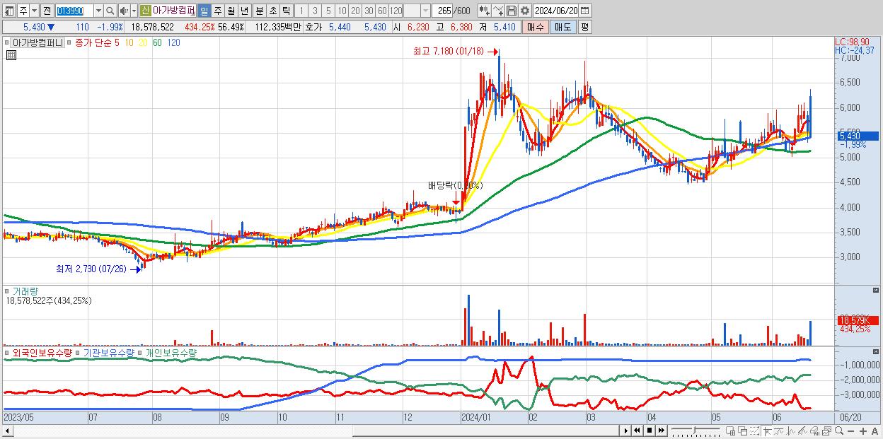 - 아가방컴퍼니 (5,430원 ▼ -1.99% , 시총: 1,786억, 거래량: 18,578,522, 거래대금:1,123억)