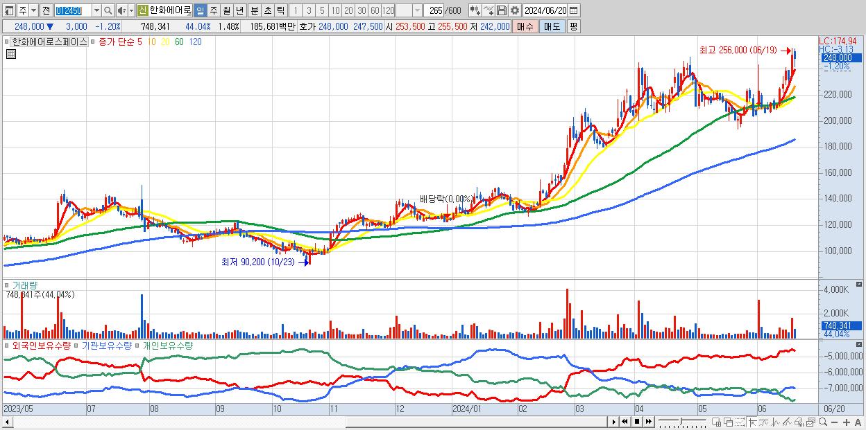 - 한화에어로스페이스 (248,000원 ▼ -1.2% , 시총: 125,562억, 거래량: 748,341, 거래대금:1,857억)