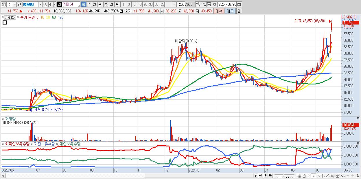 - 카페24 (41,750원 ▲ 11.78% , 시총: 10,126억, 거래량: 10,863,803, 거래대금:4,437억)