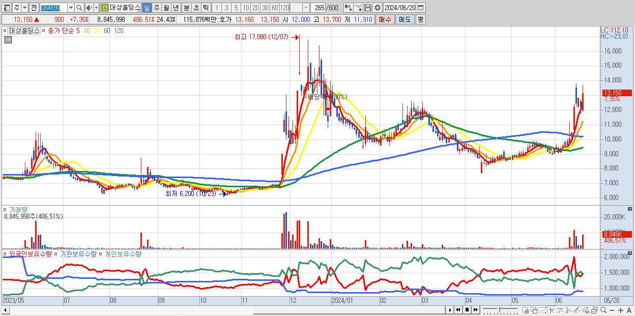 - 대상홀딩스 (13,150원 ▲ 7.35% , 시총: 4,762억, 거래량: 8,845,998, 거래대금:1,159억)