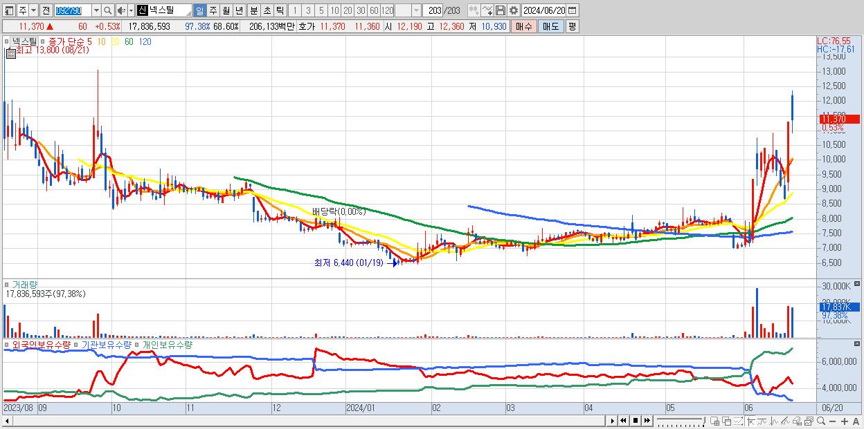 - 넥스틸 (11,370원 ▲ 0.53% , 시총: 2,956억, 거래량: 17,836,593, 거래대금:2,061억)