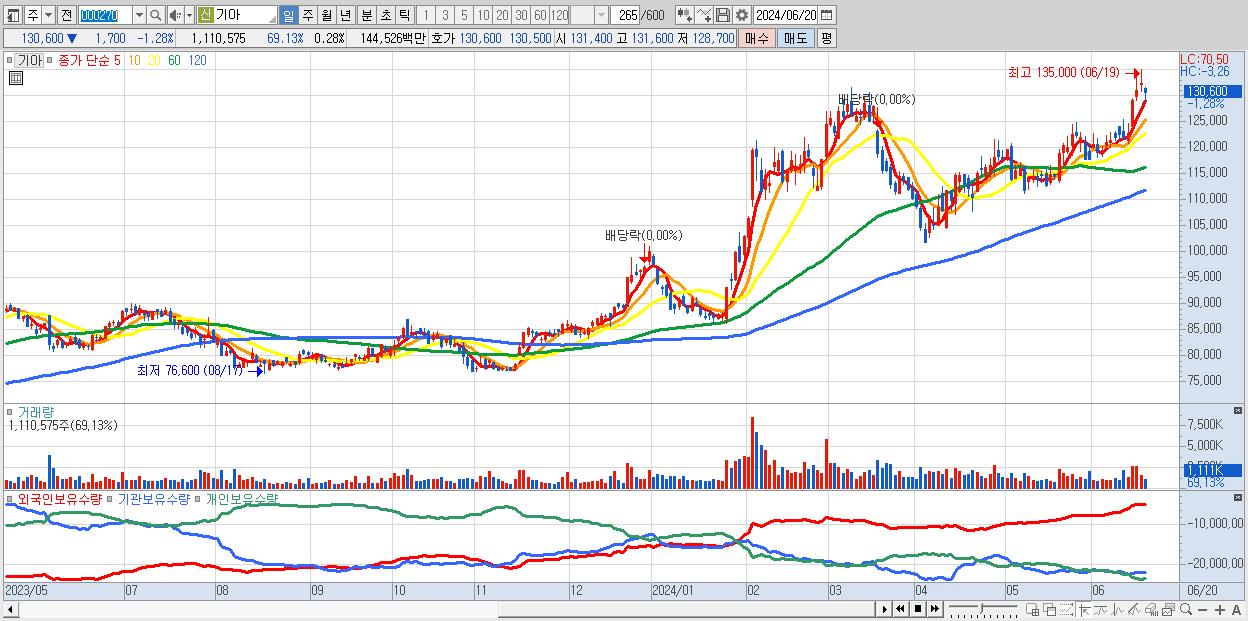 - 기아 (130,600원 ▼ -1.28% , 시총: 522,215억, 거래량: 1,110,575, 거래대금:1,445억)