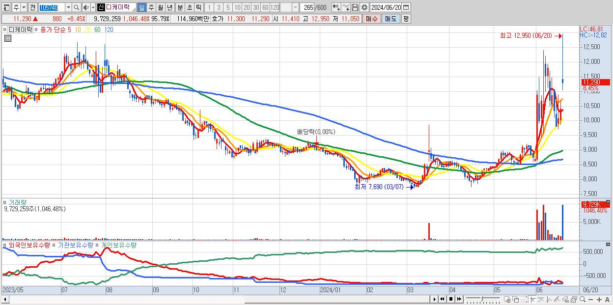 - 디케이락 (11,290원 ▲ 8.45% , 시총: 1,147억, 거래량: 9,729,259, 거래대금:1,150억)
